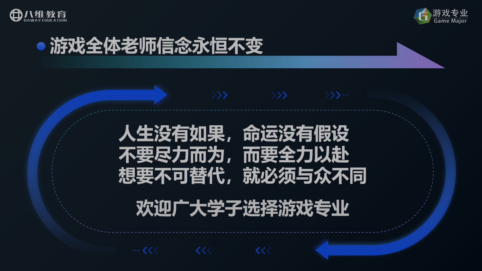 北京八维研修学院游戏专业秉持“人生没有如果,命运没有假设。不要尽力而为,而要全力以赴,要想不可替代,就要与众不同”的格言,这正是数字时代的生存法则: